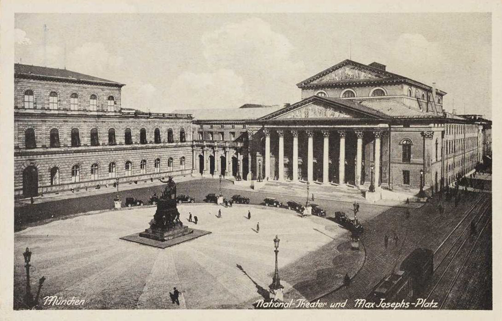 Der Platz war und ist einer der Knoten- und Versammlungsorte der Stadt München. Die kleinen runden Pflastersteine, sogenannte Isarkiesel, die ein Strahlenmuster um das mittig auf dem Platz stehende Max-Joseph-Denkmal formen, wurden drei Jahre nach Fertigstellung des Monuments, im Jahr 1838, verlegt. An der Nordseite grenzt die Residenz an den Platz; an der Ostseite steht das Nationaltheater. An der Südseite schließt die Maximilianstraße und an der Westseite die Residenzstraße an. Auf dieser Postkarte von um 1930 erscheint die Fassade des alten Residenztheaters links neben dem Nationaltheater ohne den Glasbau im Obergeschoss, den es bis etwa 1920 noch hatte. | Erstellt von: unbekannt | Quelle: Zentralinstitut für Kunstgeschichte, Photothek/Sammlungen, ZI-0954-07-00-Th238550 | Rechte: vorbehalten