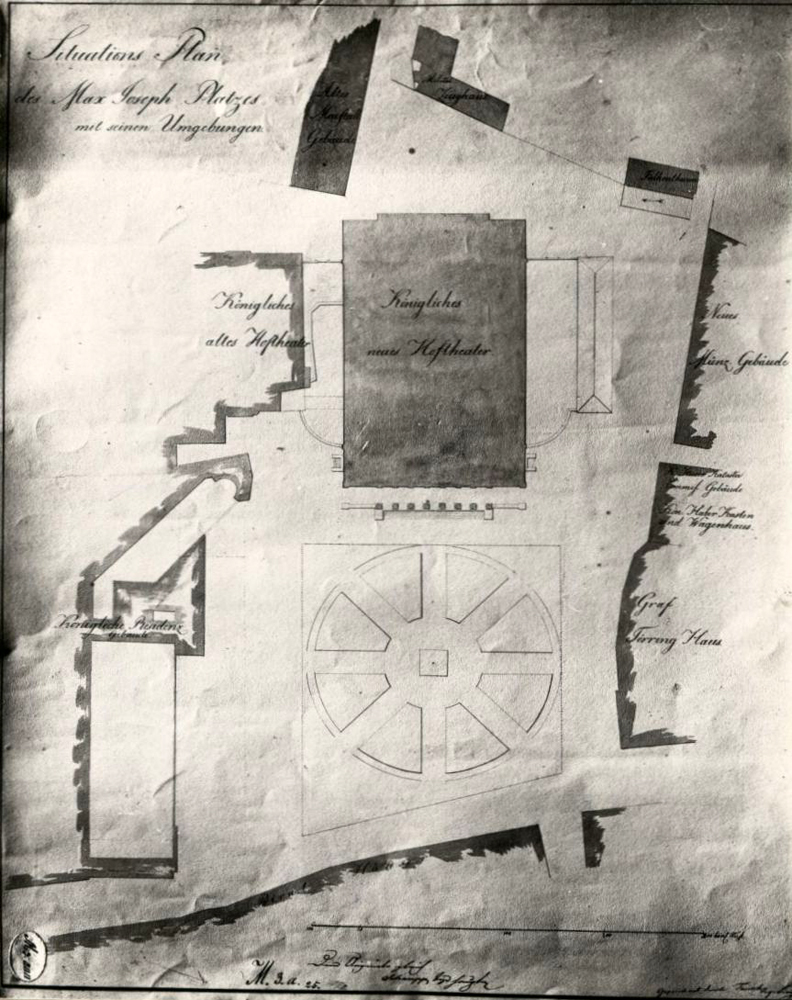 Am 26. März 1820 beschloss der Münchner Magistrat, dem König ein Denkmal zu errichten. Leo von Klenze wurde daraufhin bald in den Planungsprozess involviert. Der Grundstein für den Sockel wurde 1824, im Jahr des 25-jährigen Regierungsjubiläums Maximilians, gelegt. Im Zuge der Ausführung machte man sich auch um die Platzgestaltung Gedanken. Nach dem Bau des Nationaltheaters fehlte dem Platz jedoch immer noch ein verbindendes Element. Dieser „Situationsplan“ aus dem Bauamt (gezeichnet von Franz von Tausch) ist eher als Entwurf zu verstehen. Geplant waren acht Kreissegmente (wohl mit Grünanlagen) mit sternförmigen Zuwegen um das Monument. Der Plan wurde 2025 zur Platzgestaltung zu Rate gezogen. | Quelle: Zentralinstitut für Kunstgeschichte, Photothek/Sammlungen, ZI-LEHM-005-03-02-497263 | Rechte: vorbehalten