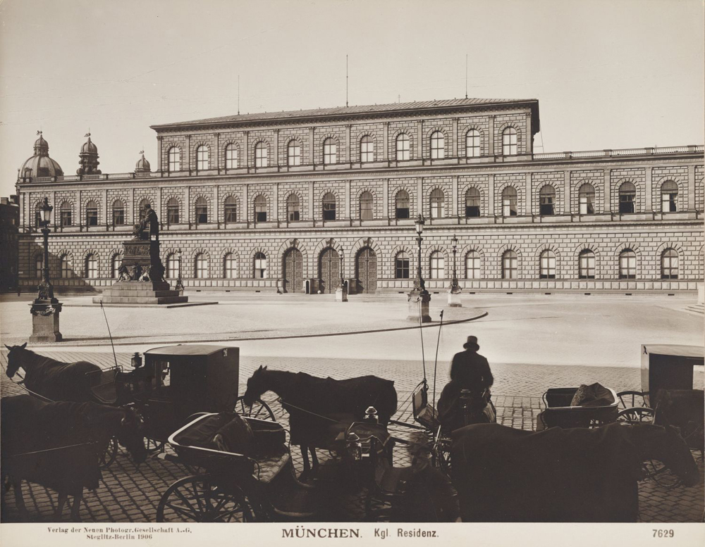 Auch zur vorletzten Jahrhundertwende befand sich auf der Südseite des Max-Joseph-Platzes ein Taxistand. Um 1900 warteten dort die Kutschen für die Bürgerinnen und Bürger. Zu dieser Zeit wurden um das Maxmonument nun acht Laternen in regelmäßigen Abständen aufgestellt und um Sockel erhöht. | Erstellt von: Neue Photographische Gesellschaft, Steglitz-Berlin | Quelle: Zentralinstitut für Kunstgeschichte, Photothek/Sammlungen, ZI-0918-08-00-217275 | Rechte: Public Domain