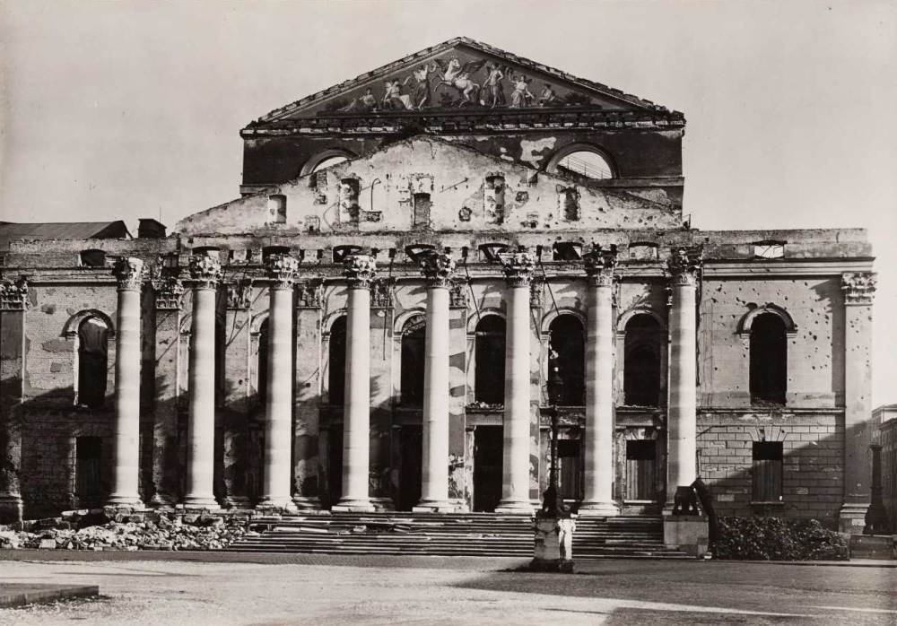 Im Zweiten Weltkrieg wurde das Gebäude bis auf seine Umfassungsmauern zerstört. Den Wettbewerb um den Wiederaufbau gewann 1955 Gerhard Graubner (1899‒1970). Anlässlich des Wiederaufbaus wurde erneut über eine Umgestaltung des Theaters diskutiert, man entschied sich aber für einen Wiederaufbau nach Karl von Fischers Originalplänen. | Erstellt von: Foto Marburg, Trümmerkampagne, Neg. Nr. 202554 | Quelle: Zentralinstitut für Kunstgeschichte, Photothek/Sammlungen, ZI-0934-01-00-010464 | Rechte: vorbehalten