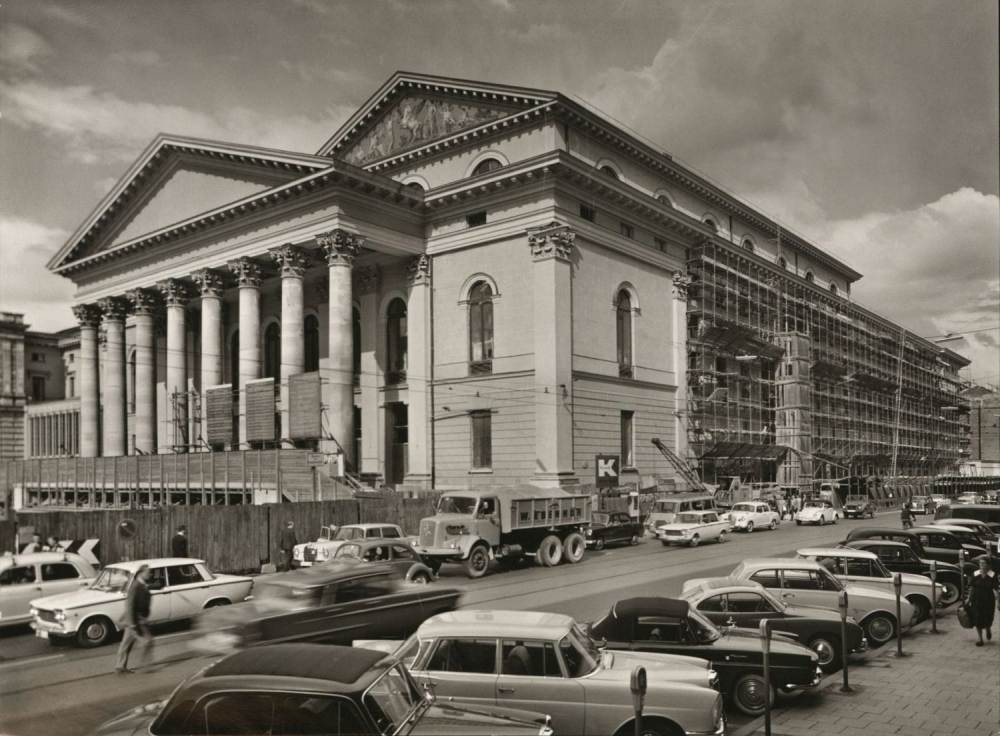 Die Außenfassade wurde nahezu identisch wiederaufgebaut. Der Wiederaufbau wurde von 1958 bis 1963 realisiert. Das obere Giebelmosaik konnte erhalten werden. Das zweite Mosaik über dem Portikus war zerstört und blieb zunächst noch frei. | Erstellt von: E. Zickmantel, Fremdenverkehrsamt München | Quelle: Zentralinstitut für Kunstgeschichte, Photothek, Bildarchiv Bruckmann, ZI-BAB-28-Arch-046 | Rechte: vorbehalten