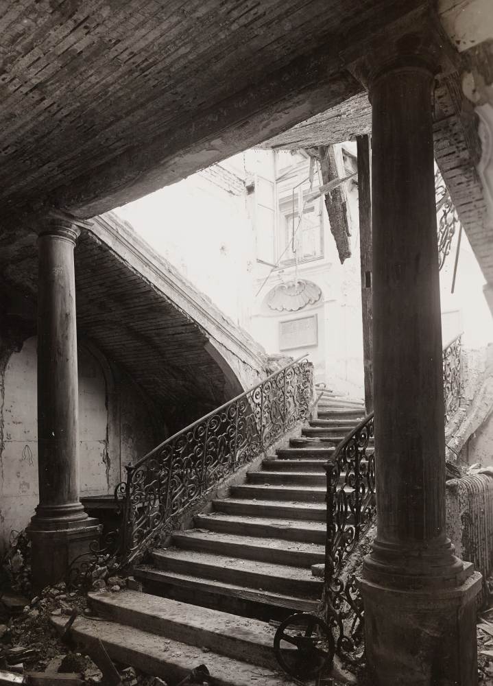 Prunktreppenhaus, kriegszerstört. ID: 2379 | Diese Datei wird angezeigt in: Das Palais Preysing Auch das Treppenhaus wurde während der Bombardierung am 15. April 1944 stark beschädigt. | Quelle: Zentralinstitut für Kunstgeschichte, Photothek/Archiv, ZI-0963-06-00-000852 / © Bildarchiv Foto Marburg | Rechte: CC BY-SA 4.0 SourceZentralinstitut für Kunstgeschichte, Photothek/Archiv, ZI-0963-06-00-000852 / © Bildarchiv Foto MarburgRightsCC BY-SA 4.0 "Prunktreppenhaus, kriegszerstört." wird angezeigt in: Das Palais Preysing