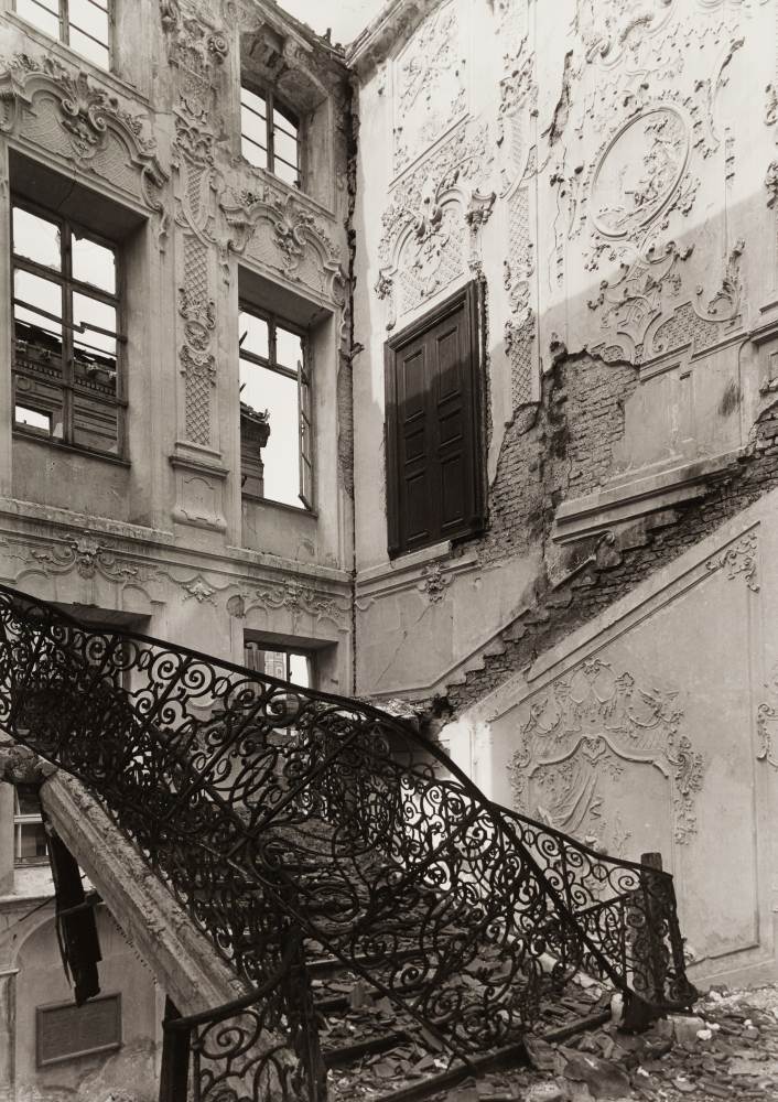 Reste des Stuckdekors im kriegszerstörten Treppenhaus. ID: 2380 | Diese Datei wird angezeigt in: Das Palais Preysing Im kriegszerstörten Treppenhaus haben sich Reste der reichen Stuckmotive – Gitterfelder, Band- und Blattwerk sowie figürliche Motive – erhalten. | Quelle: Zentralinstitut für Kunstgeschichte, Photothek/Archiv, ZI-0963-06-00-325027 / © Bildarchiv Foto Marburg | Rechte: CC BY-SA 4.0 SourceZentralinstitut für Kunstgeschichte, Photothek/Archiv, ZI-0963-06-00-325027 / © Bildarchiv Foto MarburgRightsCC BY-SA 4.0 "Reste des Stuckdekors im kriegszerstörten Treppenhaus." wird angezeigt in: Das Palais Preysing