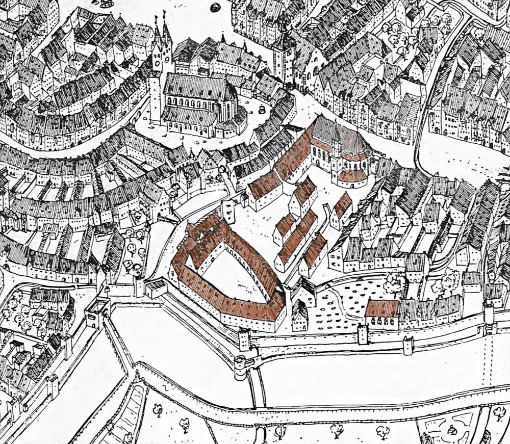 1920 fertigte Gustav Steinlein eine detaillierte Zeichnung nach dem um 1570 entstandenen Stadtmodell von Jakob Sandtner. Der Kirchturm der Spitalkirche ist allerdings eine Ergänzung, weil dieses Element des Modells bereits früh verloren ging. | Quelle: Gustav Steinlein, Die Baukunst Alt-Münchens. Eine städtebauliche Studie über die Münchener Bauweise von der Gründung der Stadt bis Ende des 16. Jahrhunderts, Bayerischer Heimatschutz, ca. 1920, Tafel VIII, Abb. 66 (Detail). | Rechte: vorbehalten
