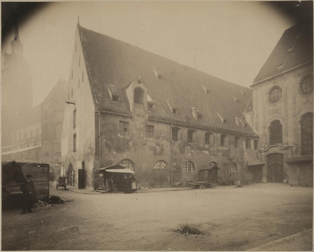 1884 stand als letztes der früheren Spital-Gebäude nur noch das Weiber-Spital. Seit 1870 befand sich darin die Fleischbank. Im Hintergrund ist ein Teil der sogenannten Metzgerzeile auf der anderen Straßenseite zu sehen. | Erstellt von: Anton Schiessl | Quelle: Südfassade des Heiliggeistspitals, 1884, Stadtarchiv München, Inv. Nr. FS-NL-KV-0176 | Rechte: gemeinfrei