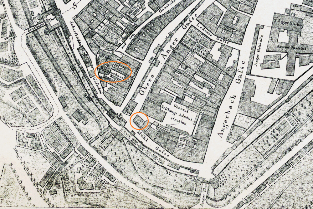 Nach der Auflösung des Frauenhauses diente das Gebäude später zeitweise als Krankenhaus und damit als Vorläufer des 1742 errichteten Nockher-Krankenhauses. Diese private Stiftung befand sich zwischen heutigem Roßmarkt und Oberanger. | Quelle: Steuervermessungskommission Bayern, Uraufnahme Ortsblatt München, 1809 | Rechte: CC0 1.0