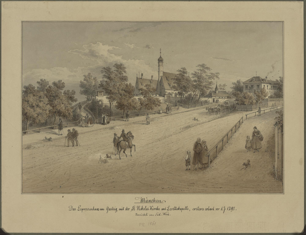 Blick den „gachen Steig“, also den Gasteig hinauf. In der Bildmitte ragt die Nikolai-Kirche heraus. Links hinter ihr befindet sich das Leprosenhaus. Rechts vor ihr steht die Loretokapelle, die 1820 stark umgearbeitet worden war. | Quelle: Carl August Lebschée, Das Leprosenhaus am Gasteig mit der St: Nikolai Kirche und Lorettokapelle, 1861, Stadtarchiv München, HV-BS-B-02-43 | Rechte: gemeinfrei