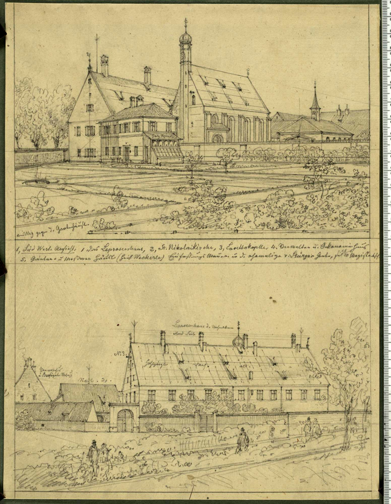 Leprosenhaus, Lebschee, rund 1840 ID: 2419 | Diese Datei wird angezeigt in: Das Leprosenhaus am Gasteig Diese auf Fluchtpunkte orientierte Zeichnung von August Lebschée zeigt das Leprosenhaus mit den dazugehörigen Gotteshäusern um 1840. Im Zuge der Anlage das Maximilianeums wurde das Leprosenhaus 1863 abgerissen. | Quelle: Carl August Lebschée, Leprosenhaus am Gasteig, ca. 1840, Stadtarchiv München, HV-BS-A-02-52 | Rechte: gemeinfrei SourceCarl August Lebschée, Leprosenhaus am Gasteig, ca. 1840, Stadtarchiv München, HV-BS-A-02-52Rightsgemeinfrei "Leprosenhaus, Lebschee, rund 1840" wird angezeigt in: Das Leprosenhaus am Gasteig