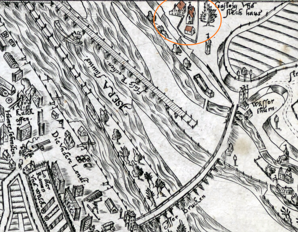 Gasteig, Volckmer, 1613 ID: 2422 | Diese Datei wird angezeigt in: Das Leprosenhaus am Gasteig Auch auf der Stadtansicht von 1613 ist zu erkennen, dass der Bereich des Leprosenhauses mit einer Mauer umfriedet war. Vor der Kirche ist ein kleineres Haus zu erkennen, das auch auf anderen Ansichten erscheint, dessen Funktion aber unklar ist. | Quelle: Tobias Volkmer d. J, Monachivm Bavariae, 1613, München, Bayerische Staatsbibliothek, Signatur Mapp. XI,441 b | Rechte: PDM 1.0 SourceTobias Volkmer d. J, Monachivm Bavariae, 1613, München, Bayerische Staatsbibliothek, Signatur Mapp. XI,441 bRightsPDM 1.0 "Gasteig, Volckmer, 1613" wird angezeigt in: Das Leprosenhaus am Gasteig
