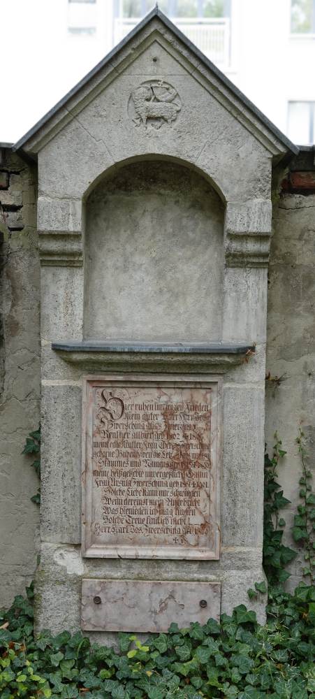 Das Grabmal ist der Rest einer ursprünglichen Familiengruft. 1901 wurde diese als „kapellenartiges Wanddenkmal, geschmückt mit Kruzifix in »haute relief« und den Wappen der Familie Zwerschina in Bubenhofen aus Bronze in Medaillonform“ beschrieben. | Erstellt von: Dr. Dr. Scherling