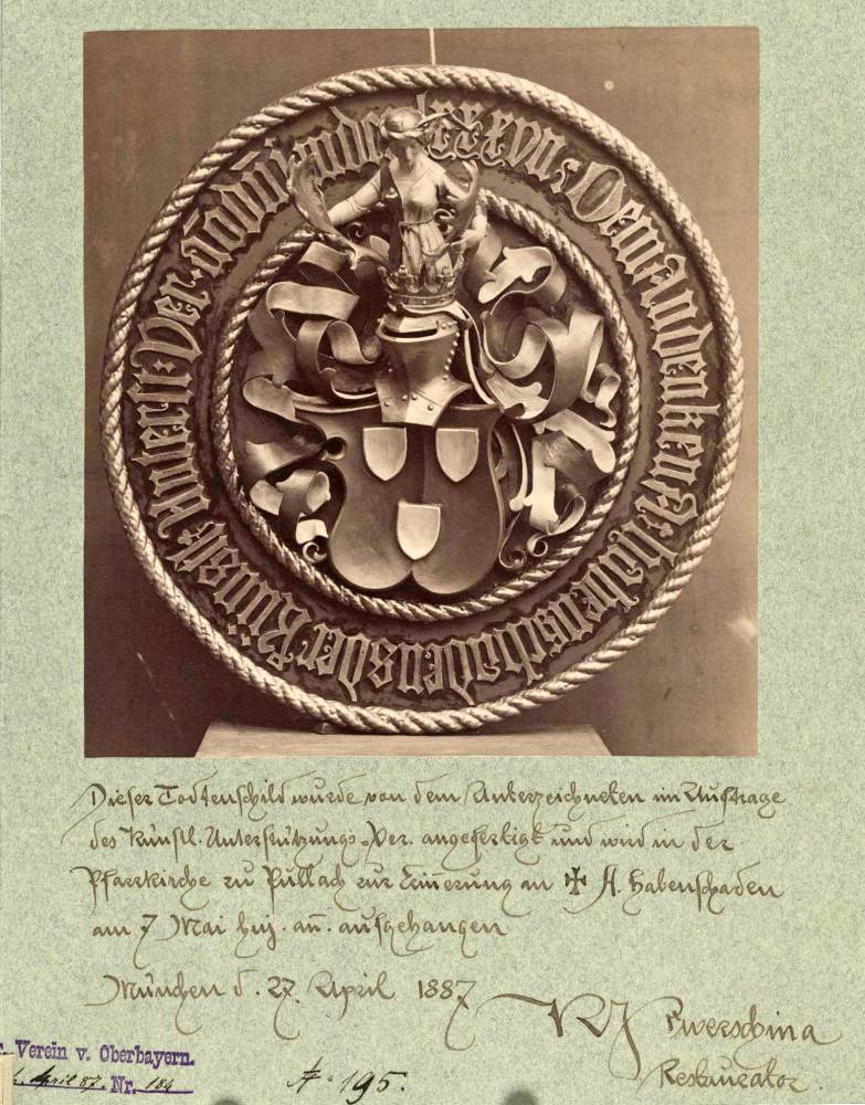Zwerschina fertigt zum Beispiel eine Gedenktafel für den Landschaftsmaler Sebastian Habenschaden (1813–1868) in der Pullacher Kirche sowie ein spätgotisches Totenschild. | Quelle: Historischer Verein von Oberbayern - Bildersammlung | Rechte: vorbehalten