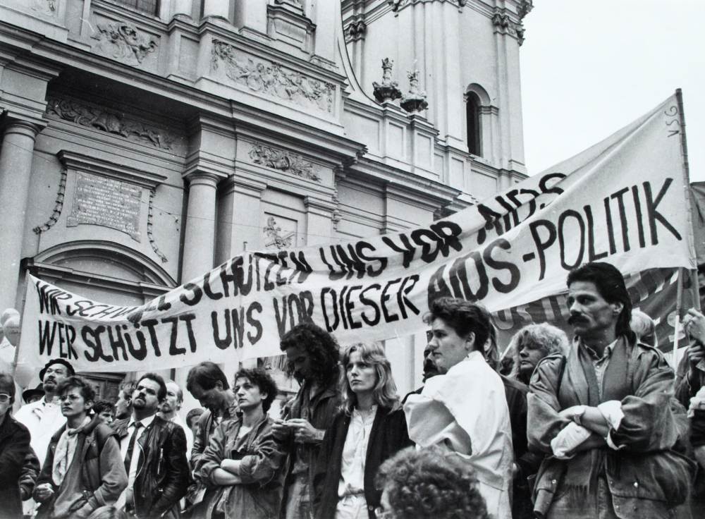Demonstration gegen den Maßnahmenkatalog zur Verhütung und Bekämpfung der Immunschwäche AIDS am 4. April 1987 auf dem Odeonsplatz ID: 2462 | Diese Datei wird angezeigt in: Der Odeonsplatz als Protestort Erstellt von: Horst Middelhoff | Quelle: Forum Queeres Archiv München | Rechte: vorbehalten CreatorHorst Middelhoff SourceForum Queeres Archiv MünchenRightsvorbehalten "Demonstration gegen den Maßnahmenkatalog zur Verhütung und Bekämpfung der Immunschwäche AIDS am 4. April 1987 auf dem Odeonsplatz" wird angezeigt in: Der Odeonsplatz als Protestort
