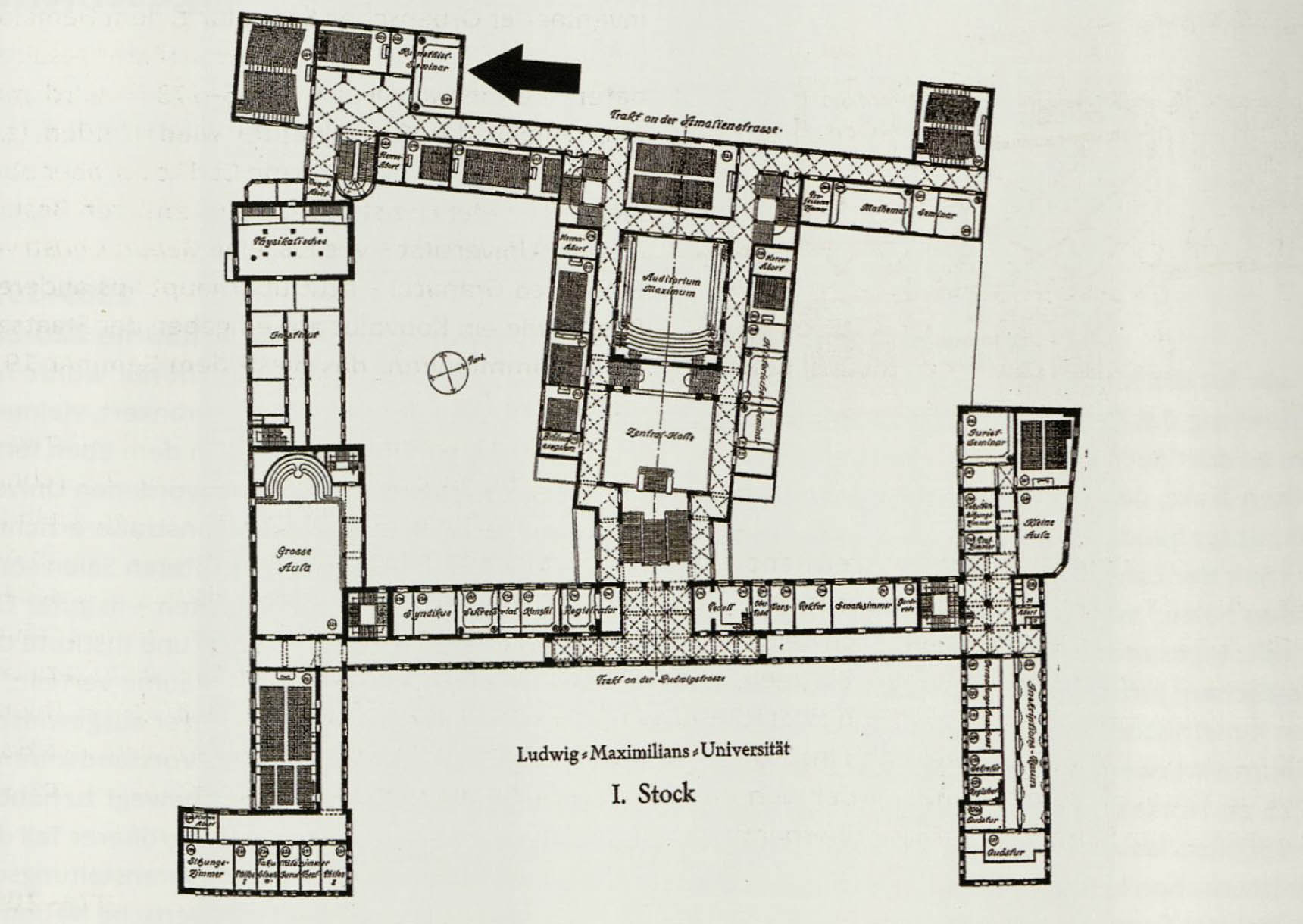 Position des „Kunsthistorische Seminar und Kupferstichsammlung“ im Bestelmeyer-Bau des Universitätshauptgebäudes mit Hörsaal, Seminarraum und Vorstandszimmer. | Quelle: Aus: Daniela Stöppel und Gabriele Wimböck: Das Institut für Kunstgeschichte in München 1909 - 2009 , München 2010, S. 10. | Rechte: vorbehalten