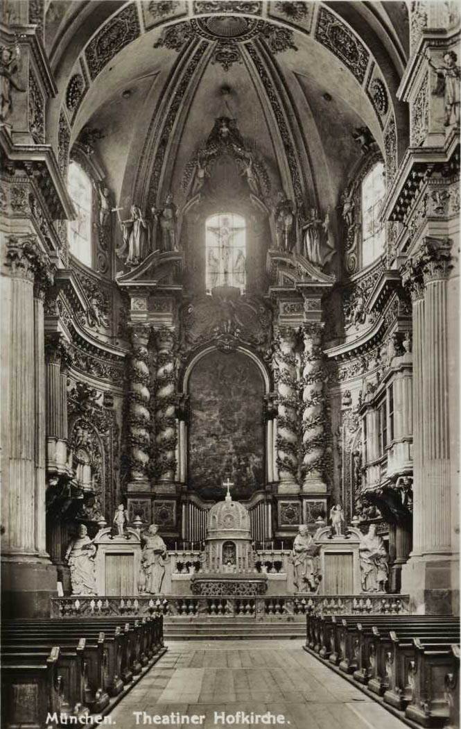 Bemerkenswert ist die räumliche Trennung von Altarretabel und Altartisch, zwischen denen der Musik- und Psallierchor seinen Platz findet. Die Kirche folgt so zum einen den Vorgaben des Trienter Konzils nach einer Ausrichtung des Raumes zum Altar (für eine unmittelbare Teilhabe für die Gläubigen), zum anderen dem Wunsch der Theatiner nach einem gesonderten Bereich für das ungestörte Gebet für die Geistlichen. | Quelle: Zentralinstitut für Kunstgeschichte, Photothek/Sammlungen, ZI-0869-01-Th238529