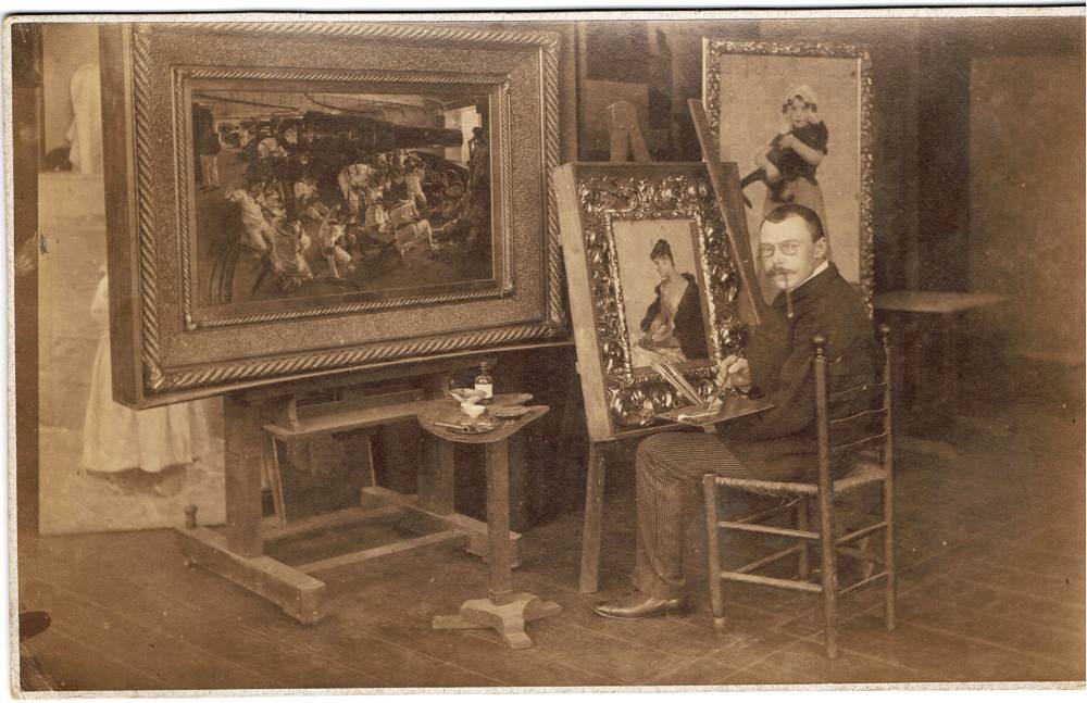Die Fotografie zeigt Paul Hoecker bei der Arbeit im Atelier (vermutlich Italien oder Oberlangenau). Das Bild stammt aus dem Nachlass seiner Nichte Vally Walter, den das Forum Queeres Archiv München aufbewahrt. | Quelle: Nachlass Vally Walter / Forum Queeres Archiv München | Rechte: vorbehalten
