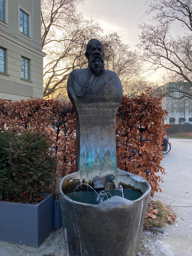Gleich neben dem Eingang befindet sich dieser Brunnen mit Büste. Sie zeigt den Prinzregenten Luitpold von Bayern (1821–1912), den Namensgeber des Café Luitpold, und wurde 1983 errichtet. | Erstellt von: Ariane Rüdiger | Quelle: Ariane Rüdiger / Forum Queeres Archiv München