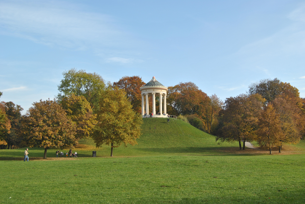 Seit der Restaurierung der ursprünglichen Situation 2011–2016 und der Rodung des Strauchbewuchses steht die Wiese auf dem Hügel, wie der Englische Garten insgesamt, unter einem enormen Nutzungsdruck. Trampelpfade tragen zur Erosion des Hanges bei. Wer sich durch den Ausblick vom Monopteros aus überraschen lassen will, sollte den Hügel lieber auf der Rückseite, auf dem Weg hinaufsteigen, statt den Grashang in der Direttissima hinaufzuklettern. Nur wenn die Millionen Besucherinnen und Besucher den hohen künstlerischen Rang der fragilen Anlage erkennen und respektieren, wird sie überleben können. | Erstellt von: Iris Lauterbach | Rechte: vorbehalten