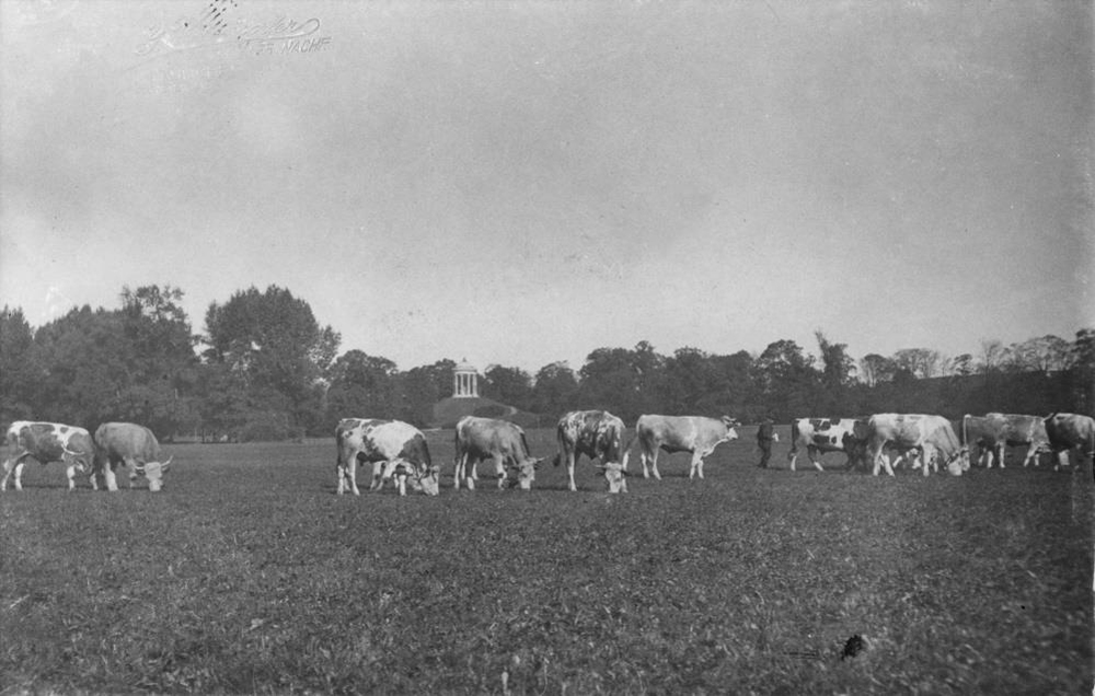 Der Fotograf interessierte sich hier offensichtlich für den stilistischen Kontrast. Im Hintergrund ist der Monopteros-Hügel zu erkennen, noch im klaren Umriss des frühen 20. Jahrhunderts. Doch im Vordergrund, auf der Schönfeldwiese, wo heutzutage die Sonnenhungrigen lagern, grast friedlich eine Kuhherde: Die Heuwiesen des Englischen Gartens wurden bis weit ins 20. Jahrhundert hinein ökonomisch genutzt. | Erstellt von: Georg Pettendorfer | Quelle: Stadtarchiv München, FS-NL-PETT2-1431 | Rechte: vorbehalten