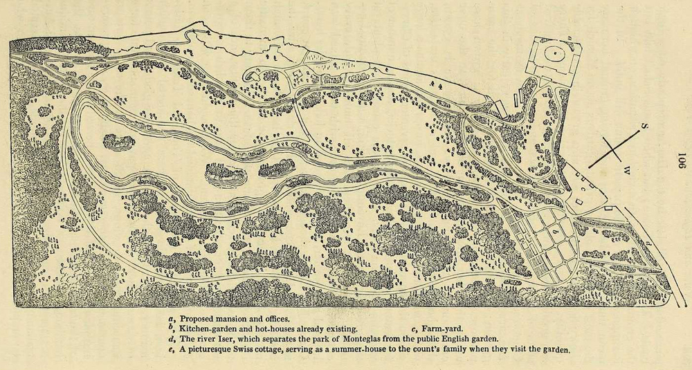1813 legte Sckell dem Grafen Montgelas einen kolorierten Plan für eine erste Erweiterung des Landschaftsgartens nach Norden hin vor, der ab Frühjahr 1814 ausgeführt wurde. Kurz zuvor war im Zuge der Isar-Begradigung auch am östlichen Ufer ein Damm angelegt worden, der die Anlage schützte: eine Voraussetzung für die Erweiterung. Der in Sckells Auftrag vom Zeichner der Hofgarten-Intendanz Dionysius Zischl gezeichnete, nicht erhaltene Plan lag dem britischen Gartenexperten John Claudius Loudon (1783–1843) vor, der 1828 München besuchte. Seine Kopie des Plans publizierte er 1833. Eine Ungenauigkeit ist zu vermerken: Ziffer d bezeichnet nicht „the river Iser“, sondern den Verlauf der heutigen Montgelasstraße. Der von Loudon publizierte Plan Sckells zeigt einen in geruhsamen Schwüngen an der Gartengrenze verlaufenden Belt Walk (Gürtelweg) und eine dichte Gestaltung der Isaraue mit Clumps (Gehölzgruppen). Die Anlage zeichnete sich durch eine in Münchner Gärten vor Sckell unbekannte Sortenvielfalt der Gehölze und blühenden Sträucher aus. | Quelle: John Claudius Loudon: The Gardener’s Magazine 1833, S. 395, fig. 106. | Rechte: Public Domain