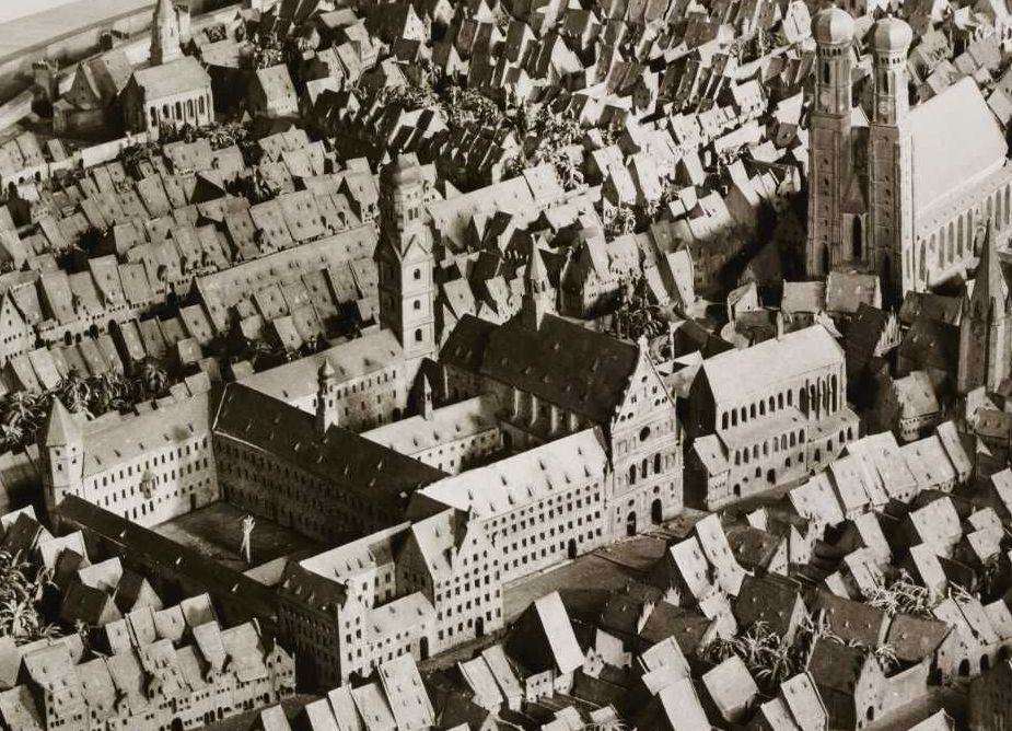 Vor der mittelalterlichen Stadt erheben sich monumental der Kollegiumskomplex, die Augustinerkirche und die Frauenkirche. Sandtner fertigte das Stadtmodell im Auftrag von Albrecht V. anhand von Plänen aus dem Jahr 1568 an. Während das Kollegium bereits 1559 unter Albrecht errichtet wurde, war die Kirche St. Michael zu diesem Zeitpunkt erst in Planung. Für den Herzog wurde die Michaelskirche von Sandtner jedoch bereits in das Modell integriert. | Erstellt von: Bayerisches Nationalmuseum München, Fotograf/in unbekannt | Quelle: Zentralinstitut für Kunstgeschichte, Photothek, ZI-0824-01-337993
