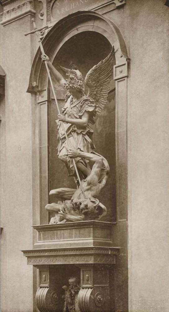 1907 werden die Figuren der Hauptfassade restauriert. Manche der 12 Steinfiguren mussten fast vollständig ausgetauscht werden. Die Nische es Erzengels Michael wurde damals wieder zum Glänzen gebracht, nachdem das Messing im Laufe der Jahre stumpf geworden war. Die Aufnahme entstand kurz nach der Restaurierung der Bronzestatue im Jahre 1907 durch die königliche Erzgießerei München. Die Bronzefigur wurde vom niederländisch-deutschen Bildhauer Hubert Gerhard 1588 geschaffen. | Erstellt von: Rehse & Co. München | Quelle: Zentralinstitut für Kunstgeschichte, Photothek, ZI-0893-01-072958