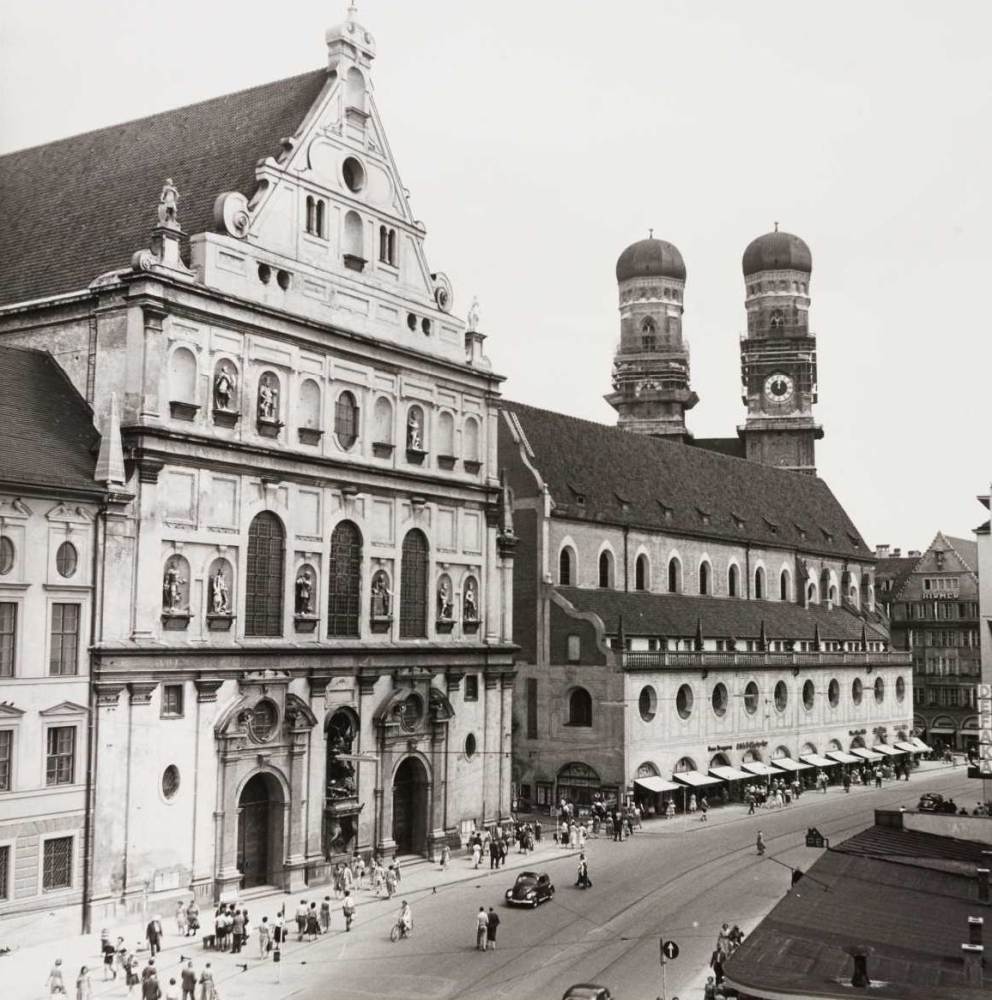 Von 1946 bis 1948 wird die Michaelskirche wiederaufgebaut. An Pfingsten 1953 wird der Bau geweiht. Nicht alle zerstörten Fassadenfiguren wurden bis zu diesem Zeitpunkt ersetzt und so blieben einige Nischen ‒ darunter auch die oberste mit dem Christus ‒ bis 1973 leer. | Erstellt von: Lala Aufsberg | Quelle: Bildarchiv Foto Marburg, Neg.Nr. 765733; Abzug Zentralinstitut für Kunstgeschichte, Photothek ZI-0891-02-316745 | Rechte: CC BY SA 4.0