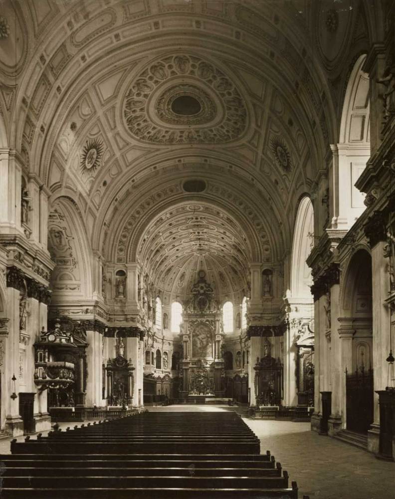 Die perfekte Halbkreiswölbung des Tonnengewölbes wird von dem Triumphbogen vor dem Chor, den Öffnungen des Querhauses zum Langhaus und den Emporen und Seitenkapellen des Langhauses wieder aufgegriffen, die sich ebenfalls halbkreisförmig öffnen. | Erstellt von: Staatliche Bildstelle Berlin | Quelle: Zentralinstitut für Kunstgeschichte, Photothek, ZI-0892-02-116599