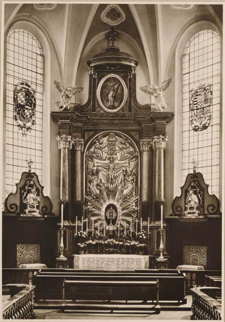 Eines der wenigen erhaltenen Ausstattungsstücke aus der Vorkriegskirche ist die Anbetungsmonstranz (1934/35) von J. Seitz. (Hier an zentraler Stelle des Hochaltars von einem Strahlenkranz umgeben). In ihr wird das Allerheiligste, eine Hostie in der nach katholischem Glauben Jesus Christus wahrhaft gegenwärtig ist, zur ewigen Anbetung ausgesetzt (das heißt präsentiert). | Quelle: Zentralinstitut für Kunstgeschichte, Photothek, ZI-0842-03-005493