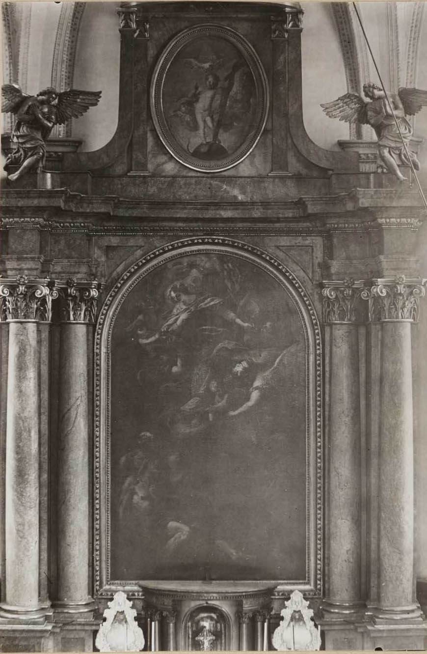 Der Hochaltar zeigt zwischen zwei Doppelsäulenpaaren ein Altarblatt von Andreas Wolff (1652–1716). Es zeigt die Heilige Elisabeth, Patronin der Vorkriegskirche mit einem Modell der Kirche. Das Auszugsgemälde ist von zwei Engelsfiguren von Andreas Faistenberger (getauft 1646; † 1735) flankiert. | Quelle: Zentralinstitut für Kunstgeschichte, Photothek, ZI-0842-03-Th159550