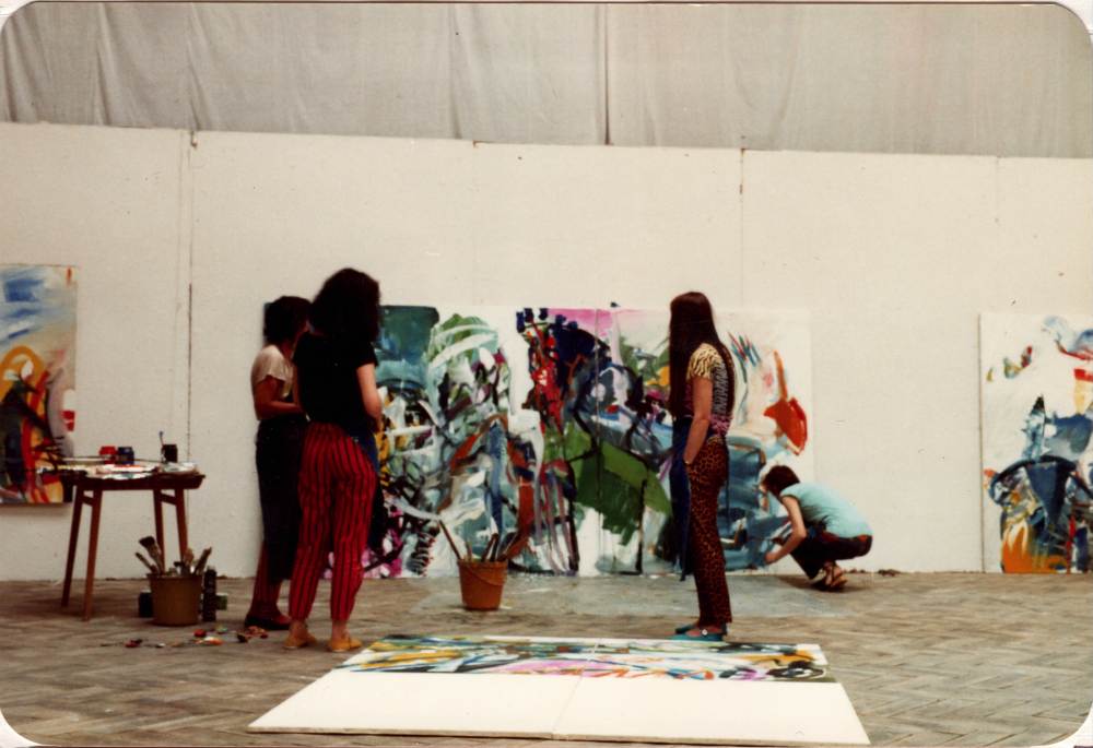 Für die Malgruppe WeibsBilder (Lisa Endriß, Lilith Lichtenberg, Alrun Prünster Soares, Sara Rogenhofer und Ursula Strauch-Sachs) hatte Kollektivmalerei viele Bedeutungsebenen: der Wechselprozess als Form, die Idee der Gruppenarbeit als gesellschaftliche und politische Praxis, feministische Kritik am Geniekult sowie die empirische Suche nach einer möglichen „weiblichen Ästhetik“. Bei der Entstehung eines Bildes wechselten Phasen der gemeinsamen Malaktion – alle Künstlerinnen arbeiteten zusammen auf der am Boden liegenden Leinwand – und Phasen des Meinungs- und Wahrnehmungsaustauschs vor dem Bild an der Wand ab. Das Foto zeigt die WeibsBilder in einer solchen Austauschphase am 17. Mai 1982 in der Historischen Aula der Akademie; auf dem Boden liegt ein weiteres, gerade begonnenes Bild. Die Werke fungierten damit gleichzeitig als Dispositiv von Arbeit, Pause, Diskussion, Konfrontation, Auseinandersetzung und gemeinsamem Erleben.