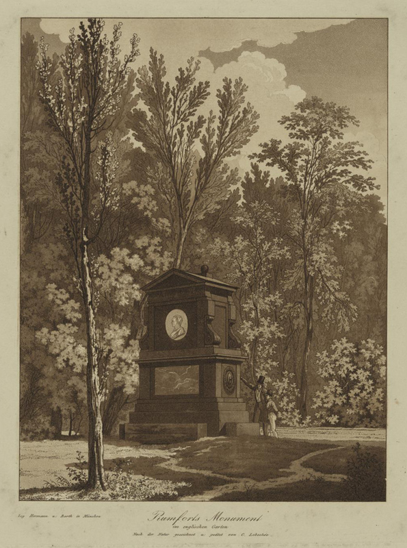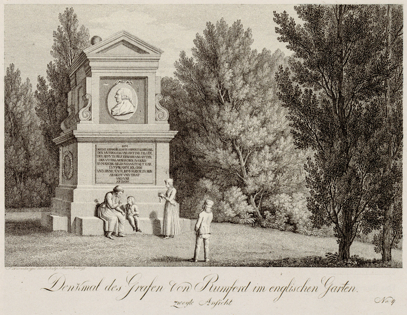 Schon zu seinen Lebzeiten, im Jahr 1796, stifteten dankbare Mitmenschen dem Naturwissenschaftler, Erfinder und Menschenfreund Benjamin Thompson (1753–1814, ab 1792 Graf Rumford) dieses Monument, das der Bildhauer Franz Jakob Schwanthaler (1760–1820) entwarf und ausführte. Es ist knapp fünf Meter hoch und besteht aus einem Sockel aus Kalkstein, über dem sich eine Giebelarchitektur aus Sandstein erhebt. Das Denkmal steht noch immer an seinem ursprünglichen Standort im Englischen Garten.